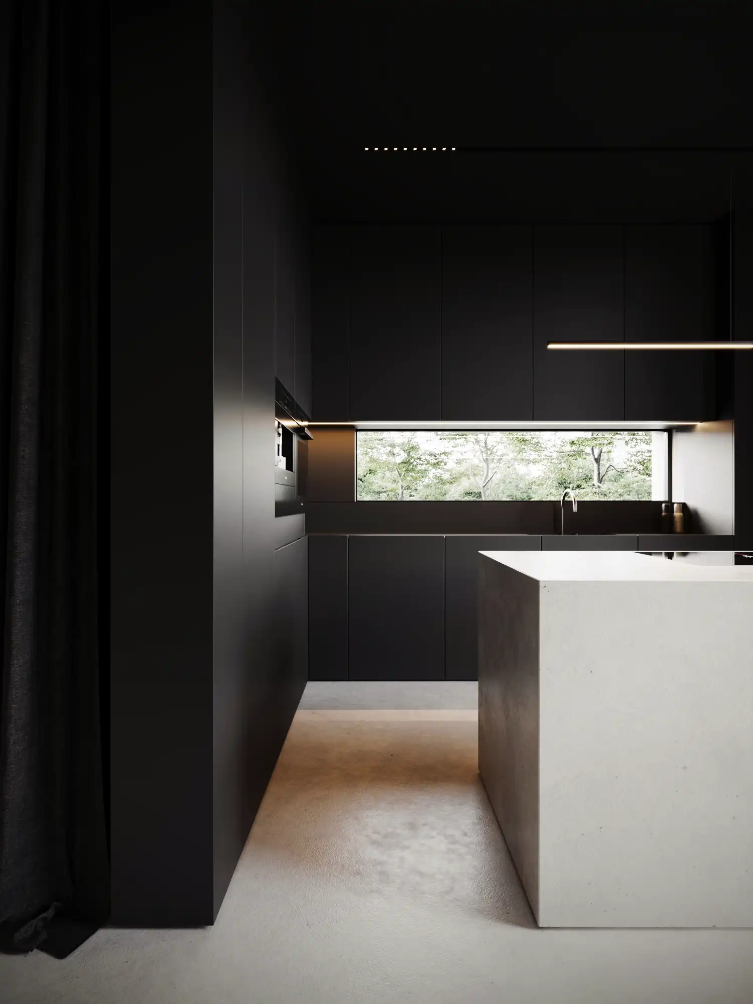 Kuchnia została zaprojektowana jako otwarta przestrzeń z wyspą, która pełni zarówno funkcję praktyczną, jak i reprezentacyjną. Fronty szafek w matowej bieli oraz czarne dodatki tworzą kontrastowy, nowoczesny efekt. Zastosowanie wysokiej jakości sprzętów AGD w zabudowie podkreśla luksusowy charakter aranżacji, a odpowiednio dobrane oświetlenie LED dodaje wnętrzu nowoczesnego wyrazu.