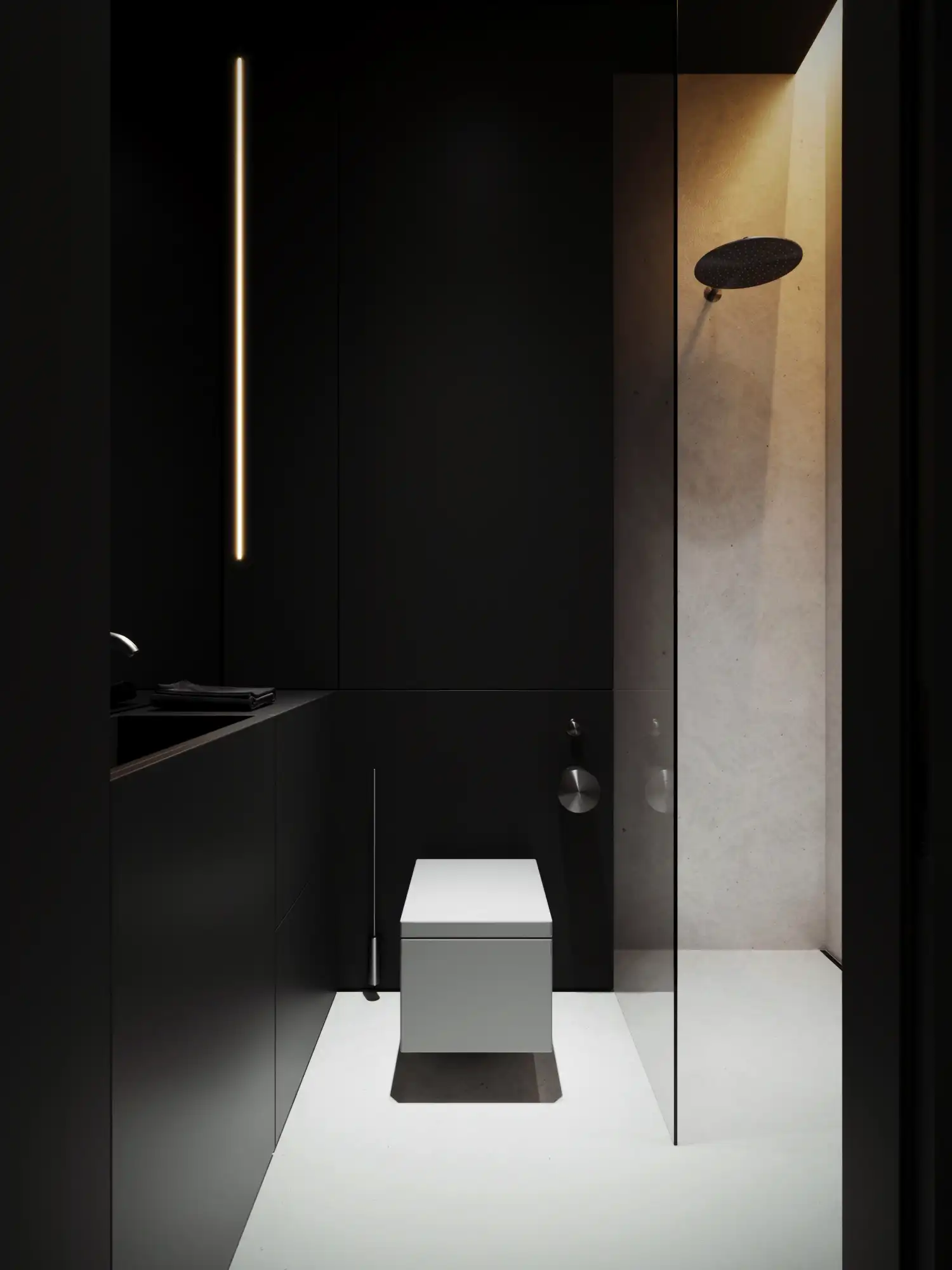 Łazienka została zaaranżowana w nowoczesnym stylu, z wykorzystaniem jasnego kamienia i czarnych detali. Duża kabina prysznicowa typu walk-in, wolnostojąca wanna oraz designerska armatura sprawiają, że wnętrze zyskuje charakter przestrzeni wellness.