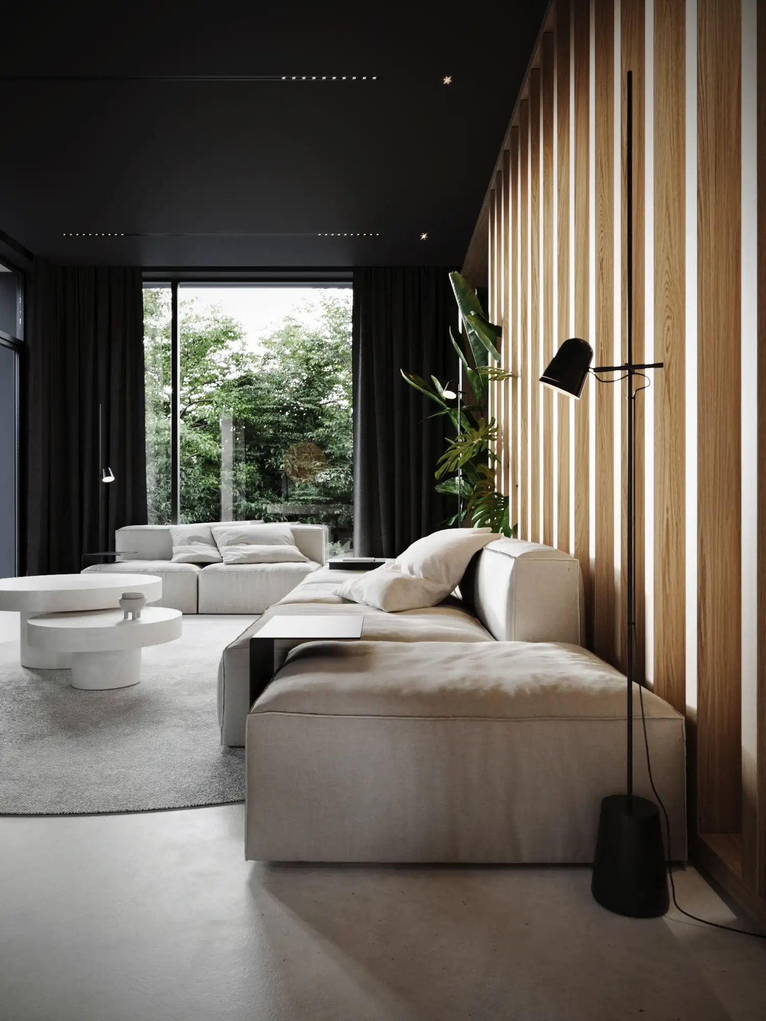 W salonie dominuje minimalistyczny wystrój, w którym proste formy mebli współgrają z neutralną kolorystyką. Biel i jasne szarości przełamane zostały drewnianymi akcentami, które dodają ciepła i naturalności. W centralnej części znalazła się wygodna sofa modułowa, otoczona designerskimi stolikami i subtelnym oświetleniem w postaci lamp stojących oraz kinkietów. Na ścianie pojawił się panel z forniru, który nadaje wnętrzu elegancji i stanowi estetyczne tło dla systemu multimedialnego.